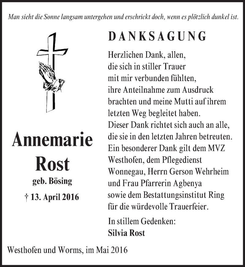 Hier finden Sie alle Traueranzeigen aus der Zeitung, die bisher für Annemarie Rost erschienen sind. Weitere Traueranzeigen, die in der Zeitung erscheinen, werden hier ebenfalls aufgelistet