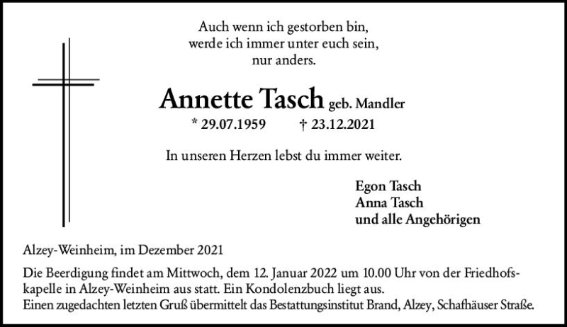 Hier finden Sie alle Traueranzeigen aus der Zeitung, die bisher für Annette Tasch erschienen sind. Weitere Traueranzeigen, die in der Zeitung erscheinen, werden hier ebenfalls aufgelistet