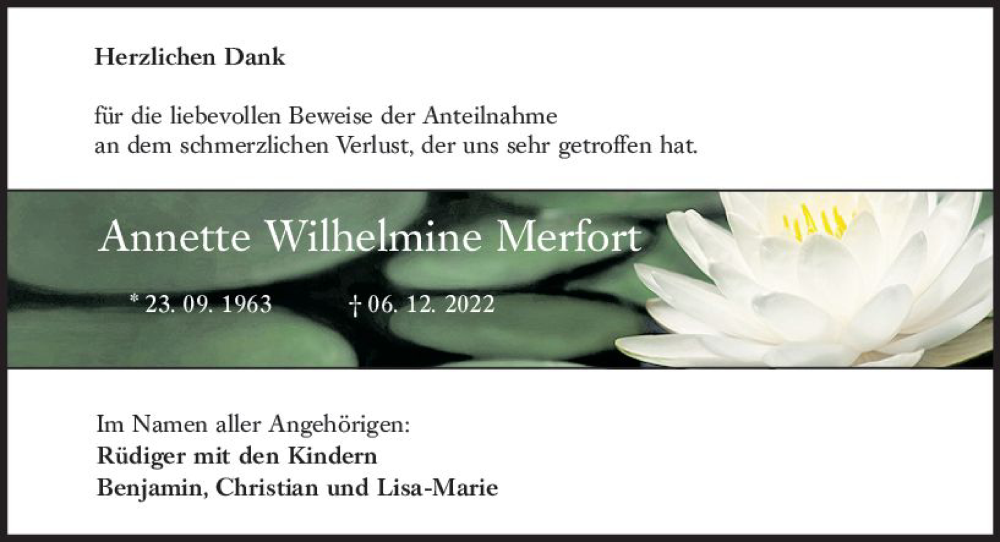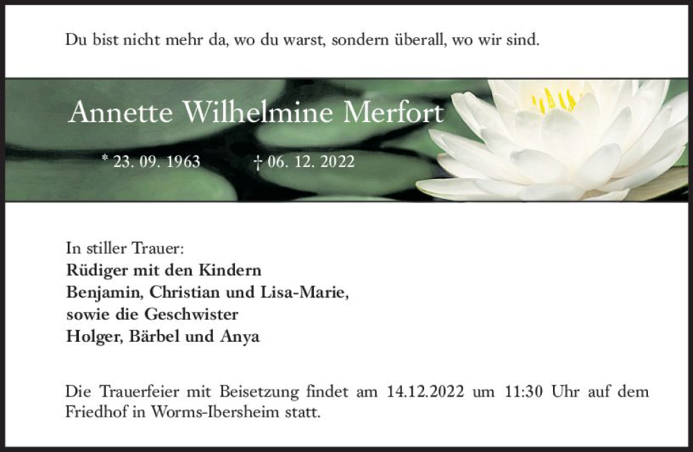Hier finden Sie alle Traueranzeigen aus der Zeitung, die bisher für Annette Wilhelmine Merfort erschienen sind. Weitere Traueranzeigen, die in der Zeitung erscheinen, werden hier ebenfalls aufgelistet
