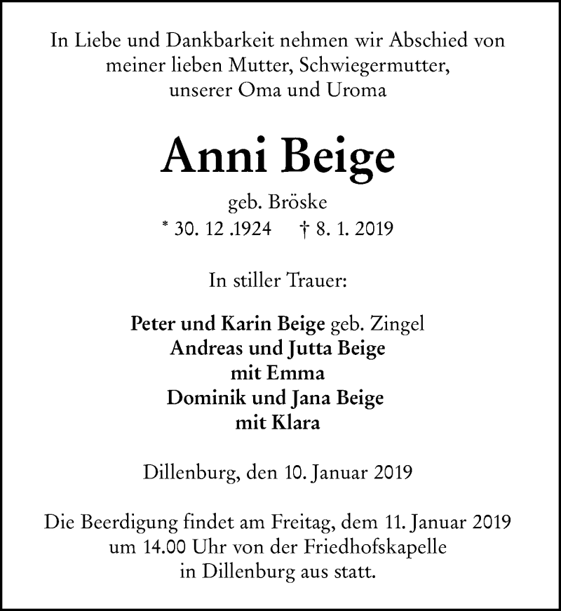 Hier finden Sie alle Traueranzeigen aus der Zeitung, die bisher für Anni Beige erschienen sind. Weitere Traueranzeigen, die in der Zeitung erscheinen, werden hier ebenfalls aufgelistet