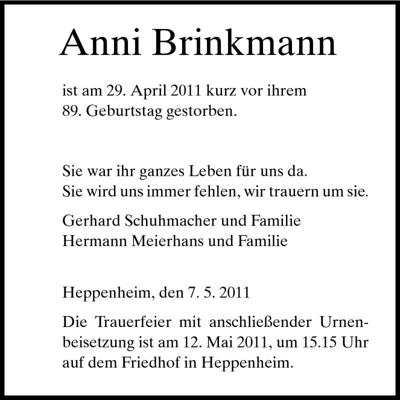 Hier finden Sie alle Traueranzeigen aus der Zeitung, die bisher für Anni Brinkmann erschienen sind. Weitere Traueranzeigen, die in der Zeitung erscheinen, werden hier ebenfalls aufgelistet