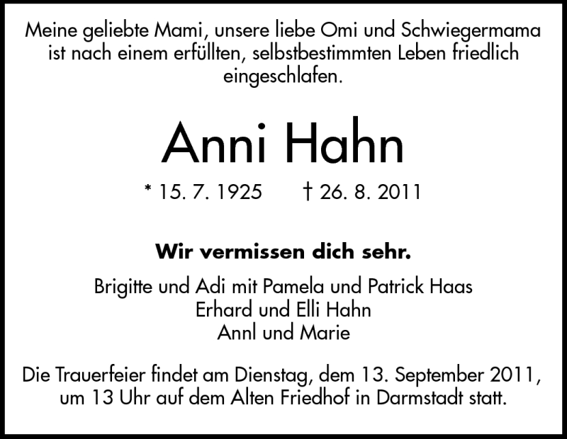 Hier finden Sie alle Traueranzeigen aus der Zeitung, die bisher für Anni Hahn erschienen sind. Weitere Traueranzeigen, die in der Zeitung erscheinen, werden hier ebenfalls aufgelistet