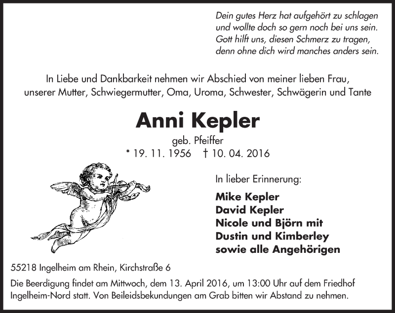 Hier finden Sie alle Traueranzeigen aus der Zeitung, die bisher für Anni Kepler erschienen sind. Weitere Traueranzeigen, die in der Zeitung erscheinen, werden hier ebenfalls aufgelistet