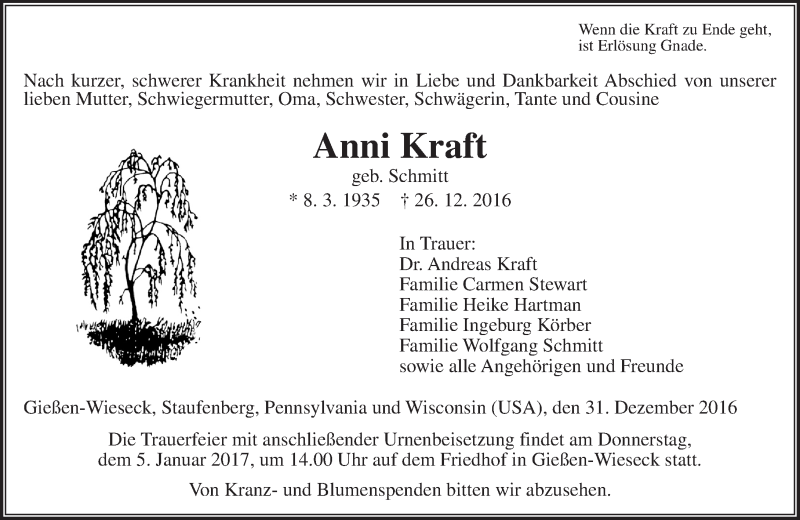 Hier finden Sie alle Traueranzeigen aus der Zeitung, die bisher für Anni Kraft erschienen sind. Weitere Traueranzeigen, die in der Zeitung erscheinen, werden hier ebenfalls aufgelistet