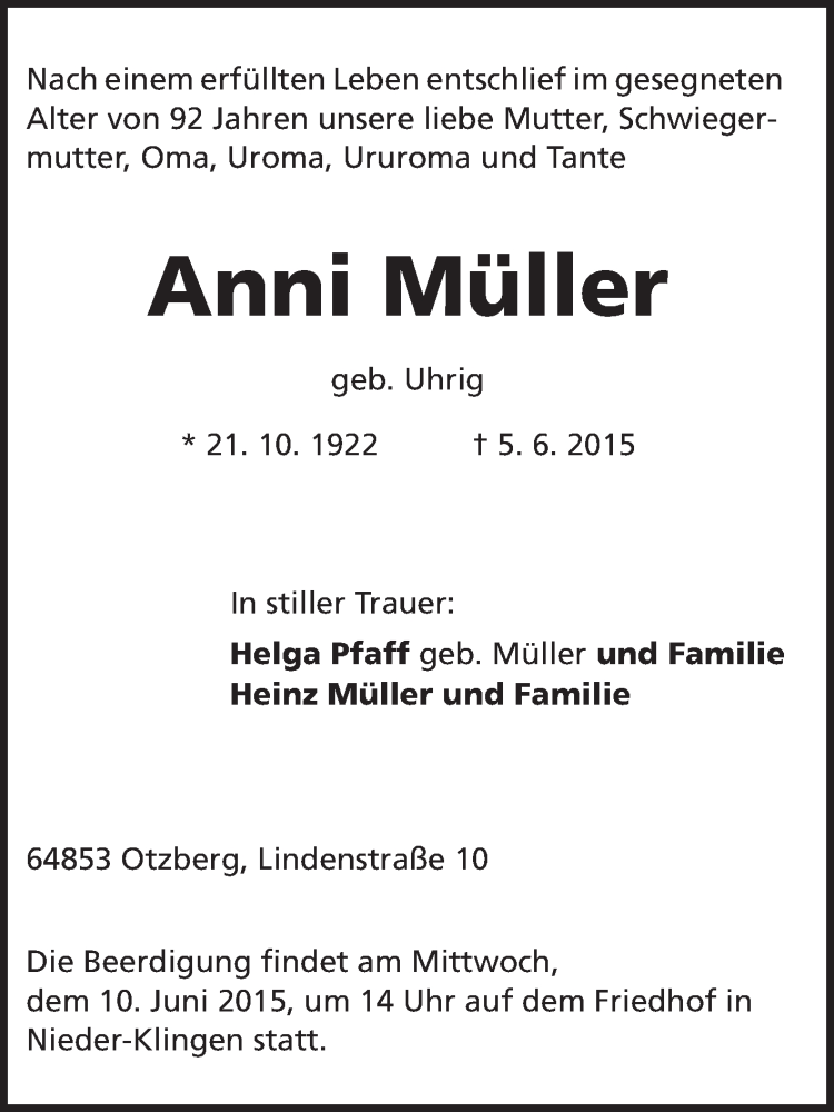Hier finden Sie alle Traueranzeigen aus der Zeitung, die bisher für Anni Müller erschienen sind. Weitere Traueranzeigen, die in der Zeitung erscheinen, werden hier ebenfalls aufgelistet
