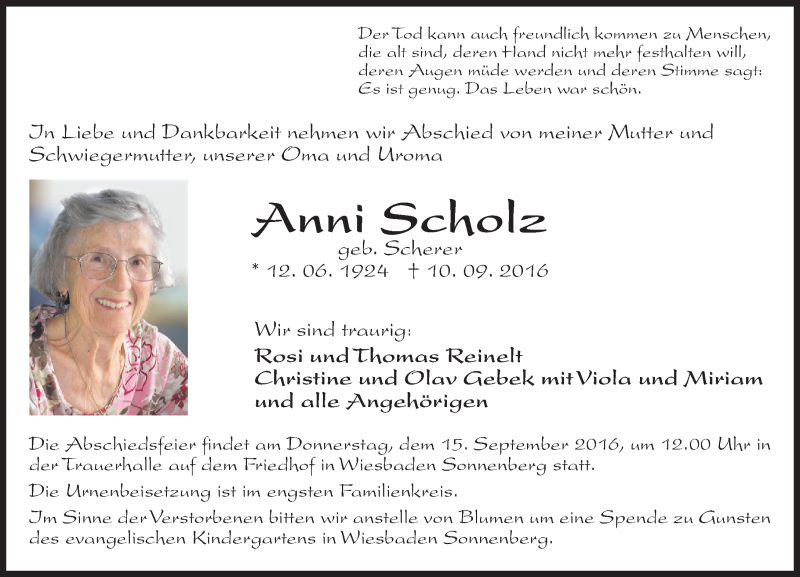 Hier finden Sie alle Traueranzeigen aus der Zeitung, die bisher für Anni Scholz erschienen sind. Weitere Traueranzeigen, die in der Zeitung erscheinen, werden hier ebenfalls aufgelistet
