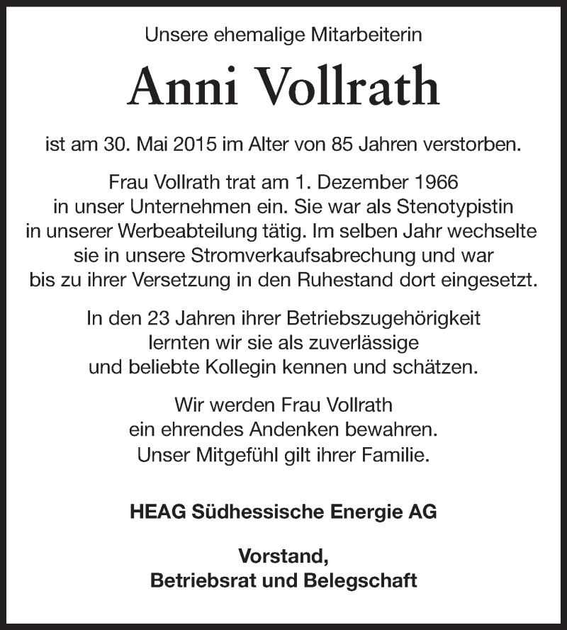 Hier finden Sie alle Traueranzeigen aus der Zeitung, die bisher für Anni Vollrath erschienen sind. Weitere Traueranzeigen, die in der Zeitung erscheinen, werden hier ebenfalls aufgelistet