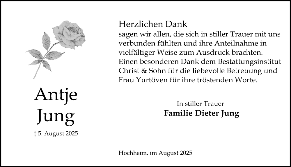 Hier finden Sie alle Traueranzeigen aus der Zeitung, die bisher für Antje Jung erschienen sind. Weitere Traueranzeigen, die in der Zeitung erscheinen, werden hier ebenfalls aufgelistet
