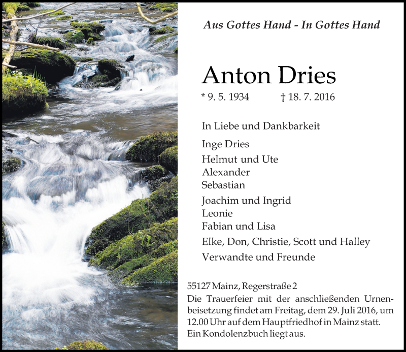 Hier finden Sie alle Traueranzeigen aus der Zeitung, die bisher für Anton Dries erschienen sind. Weitere Traueranzeigen, die in der Zeitung erscheinen, werden hier ebenfalls aufgelistet