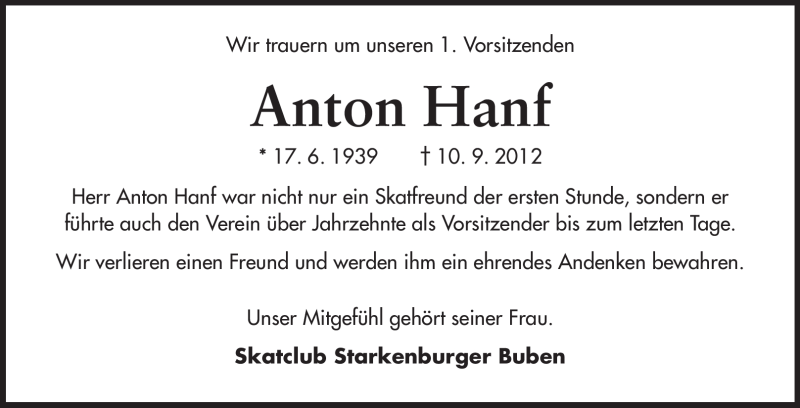 Hier finden Sie alle Traueranzeigen aus der Zeitung, die bisher für Anton Hanf erschienen sind. Weitere Traueranzeigen, die in der Zeitung erscheinen, werden hier ebenfalls aufgelistet