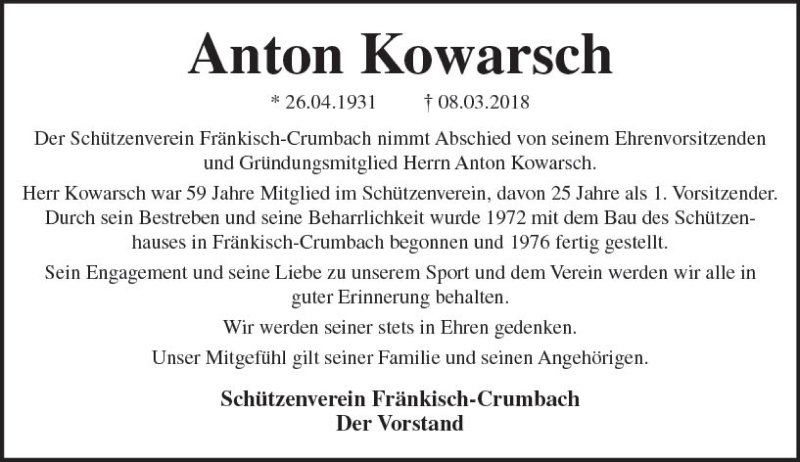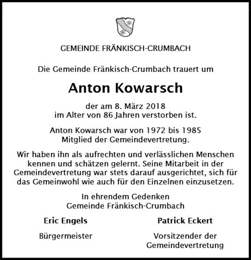 Hier finden Sie alle Traueranzeigen aus der Zeitung, die bisher für Anton Kowarsch erschienen sind. Weitere Traueranzeigen, die in der Zeitung erscheinen, werden hier ebenfalls aufgelistet