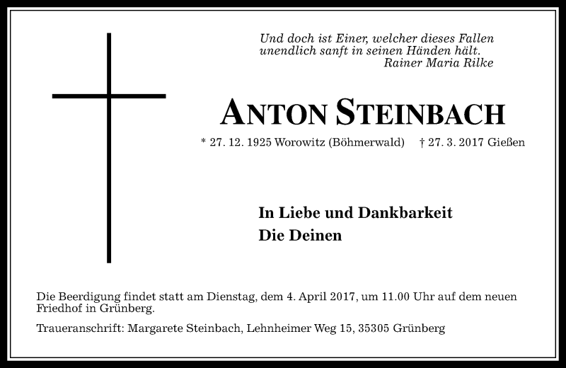 Hier finden Sie alle Traueranzeigen aus der Zeitung, die bisher für Anton Steinbach erschienen sind. Weitere Traueranzeigen, die in der Zeitung erscheinen, werden hier ebenfalls aufgelistet