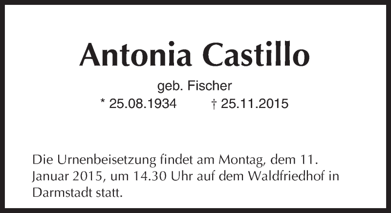 Hier finden Sie alle Traueranzeigen aus der Zeitung, die bisher für Antonia Castillo erschienen sind. Weitere Traueranzeigen, die in der Zeitung erscheinen, werden hier ebenfalls aufgelistet