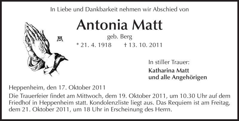 Hier finden Sie alle Traueranzeigen aus der Zeitung, die bisher für Antonia Matt erschienen sind. Weitere Traueranzeigen, die in der Zeitung erscheinen, werden hier ebenfalls aufgelistet