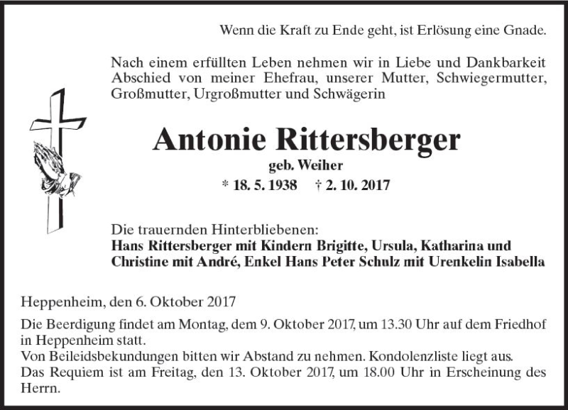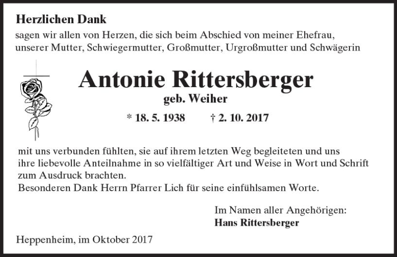 Hier finden Sie alle Traueranzeigen aus der Zeitung, die bisher für Antonie Rittersberger erschienen sind. Weitere Traueranzeigen, die in der Zeitung erscheinen, werden hier ebenfalls aufgelistet