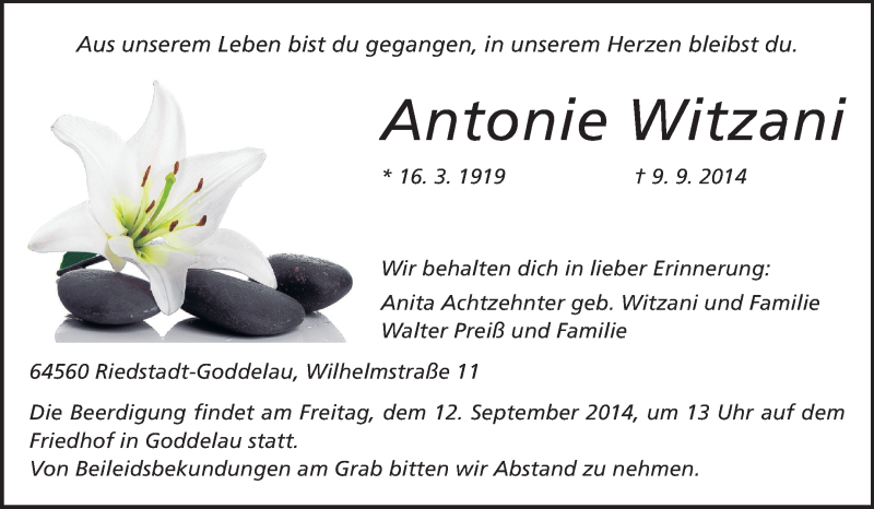 Hier finden Sie alle Traueranzeigen aus der Zeitung, die bisher für Antonie Witzani erschienen sind. Weitere Traueranzeigen, die in der Zeitung erscheinen, werden hier ebenfalls aufgelistet