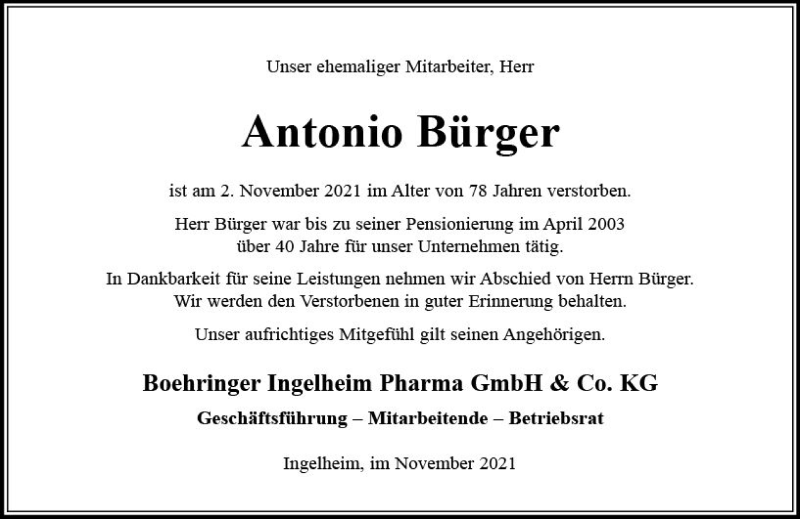 Hier finden Sie alle Traueranzeigen aus der Zeitung, die bisher für Antonio Bürger erschienen sind. Weitere Traueranzeigen, die in der Zeitung erscheinen, werden hier ebenfalls aufgelistet