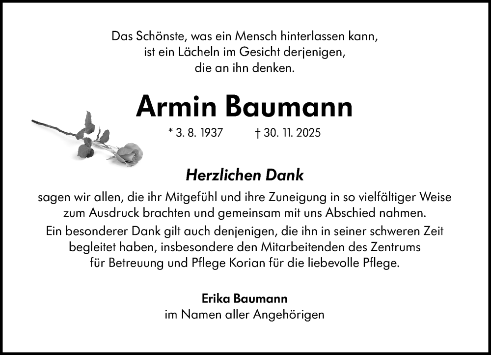 Hier finden Sie alle Traueranzeigen aus der Zeitung, die bisher für Armin Baumann erschienen sind. Weitere Traueranzeigen, die in der Zeitung erscheinen, werden hier ebenfalls aufgelistet