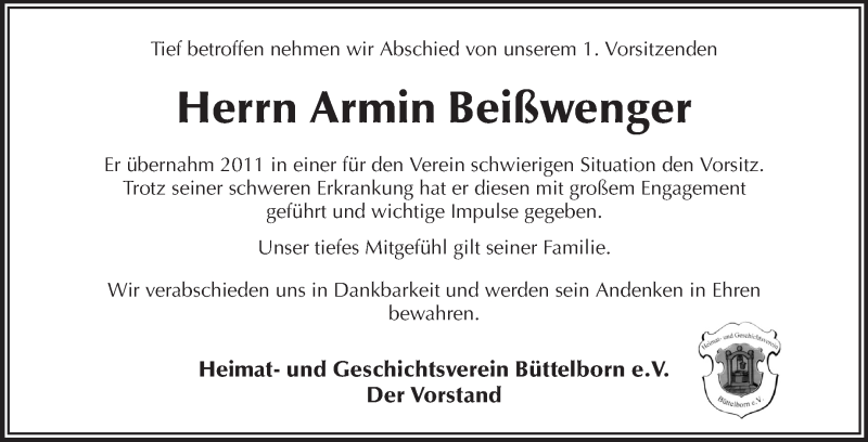 Hier finden Sie alle Traueranzeigen aus der Zeitung, die bisher für Armin Beißwenger erschienen sind. Weitere Traueranzeigen, die in der Zeitung erscheinen, werden hier ebenfalls aufgelistet