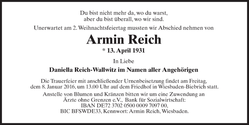 Hier finden Sie alle Traueranzeigen aus der Zeitung, die bisher für Armin Reich erschienen sind. Weitere Traueranzeigen, die in der Zeitung erscheinen, werden hier ebenfalls aufgelistet