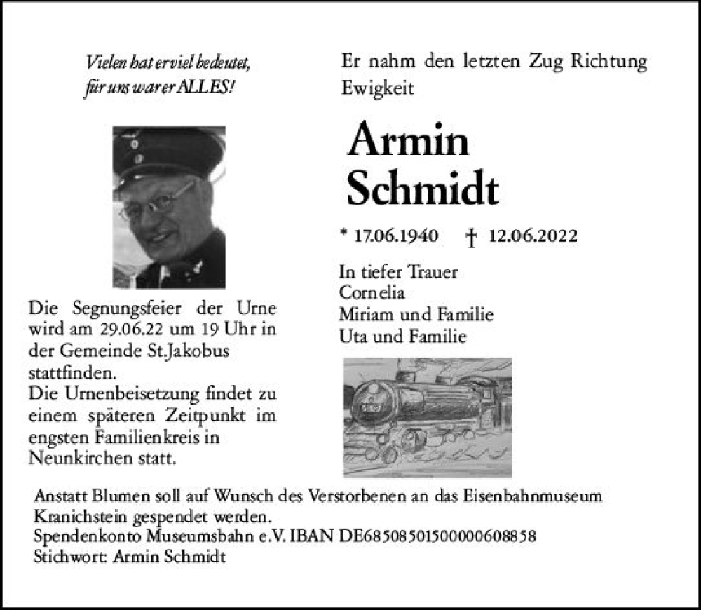 Hier finden Sie alle Traueranzeigen aus der Zeitung, die bisher für Armin Schmidt erschienen sind. Weitere Traueranzeigen, die in der Zeitung erscheinen, werden hier ebenfalls aufgelistet
