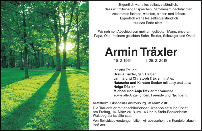 Hier finden Sie alle Traueranzeigen aus der Zeitung, die bisher für Armin Träxler erschienen sind. Weitere Traueranzeigen, die in der Zeitung erscheinen, werden hier ebenfalls aufgelistet