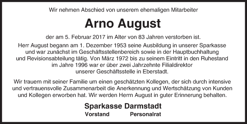 Hier finden Sie alle Traueranzeigen aus der Zeitung, die bisher für Arno August erschienen sind. Weitere Traueranzeigen, die in der Zeitung erscheinen, werden hier ebenfalls aufgelistet