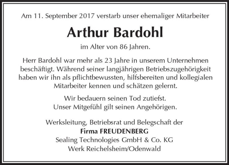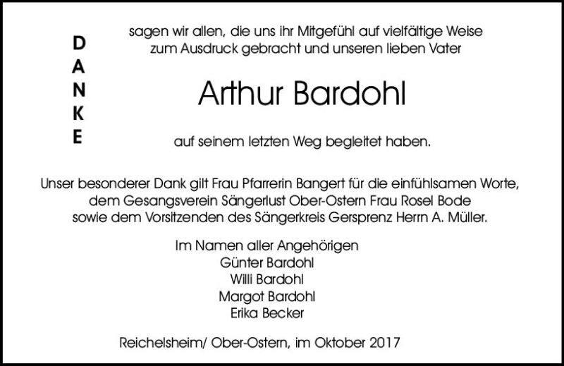 Hier finden Sie alle Traueranzeigen aus der Zeitung, die bisher für Arthur Bardohl erschienen sind. Weitere Traueranzeigen, die in der Zeitung erscheinen, werden hier ebenfalls aufgelistet