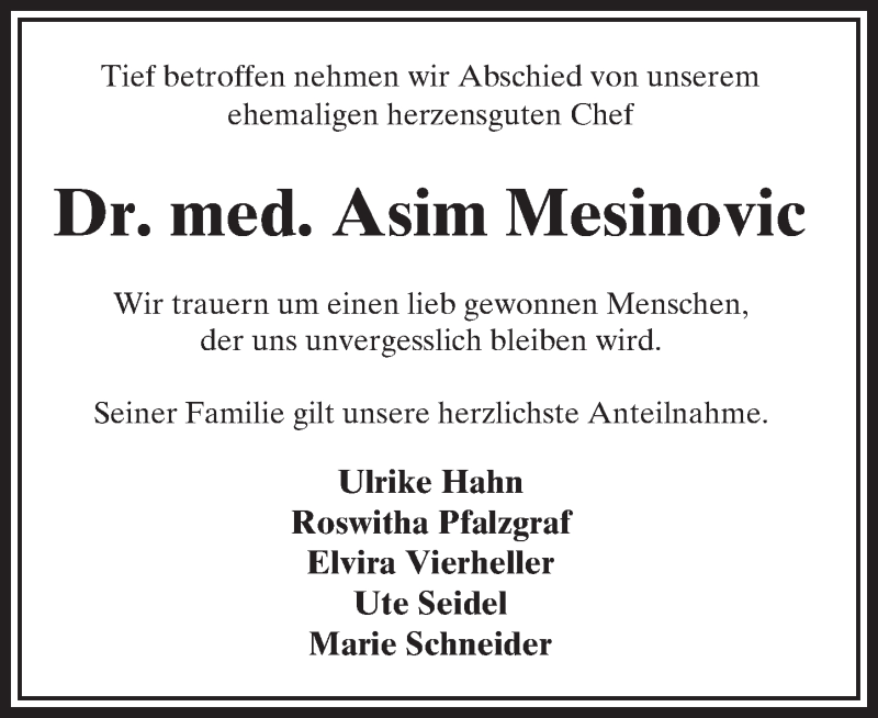 Hier finden Sie alle Traueranzeigen aus der Zeitung, die bisher für Asim Mesinovic erschienen sind. Weitere Traueranzeigen, die in der Zeitung erscheinen, werden hier ebenfalls aufgelistet