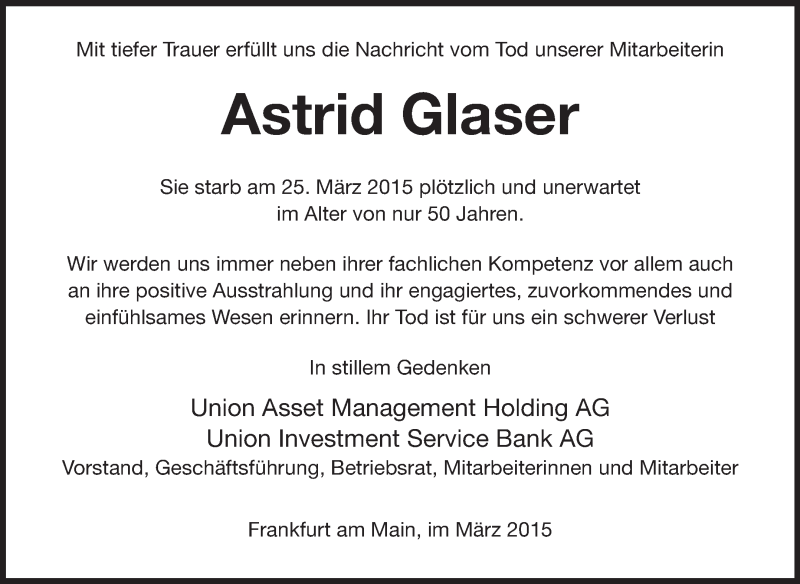 Hier finden Sie alle Traueranzeigen aus der Zeitung, die bisher für Astrid Glaser erschienen sind. Weitere Traueranzeigen, die in der Zeitung erscheinen, werden hier ebenfalls aufgelistet