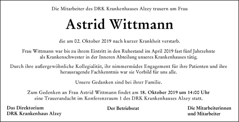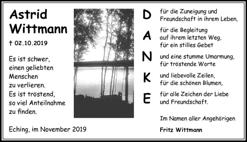 Hier finden Sie alle Traueranzeigen aus der Zeitung, die bisher für Astrid Wittmann erschienen sind. Weitere Traueranzeigen, die in der Zeitung erscheinen, werden hier ebenfalls aufgelistet