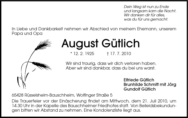 Hier finden Sie alle Traueranzeigen aus der Zeitung, die bisher für August Gütlich erschienen sind. Weitere Traueranzeigen, die in der Zeitung erscheinen, werden hier ebenfalls aufgelistet