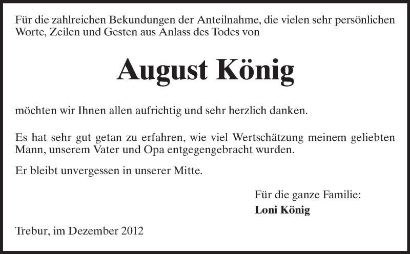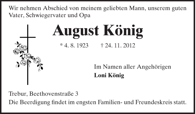 Hier finden Sie alle Traueranzeigen aus der Zeitung, die bisher für August König erschienen sind. Weitere Traueranzeigen, die in der Zeitung erscheinen, werden hier ebenfalls aufgelistet