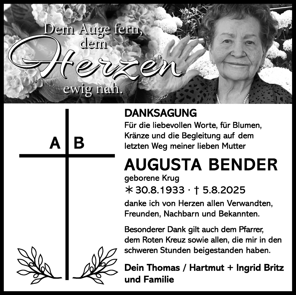 Hier finden Sie alle Traueranzeigen aus der Zeitung, die bisher für Augusta Bender erschienen sind. Weitere Traueranzeigen, die in der Zeitung erscheinen, werden hier ebenfalls aufgelistet