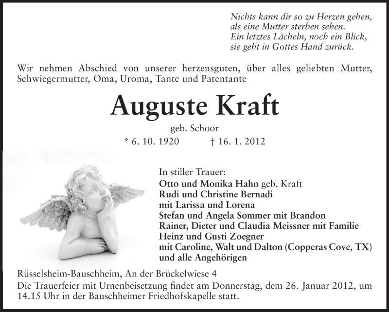 Hier finden Sie alle Traueranzeigen aus der Zeitung, die bisher für Auguste Kraft erschienen sind. Weitere Traueranzeigen, die in der Zeitung erscheinen, werden hier ebenfalls aufgelistet