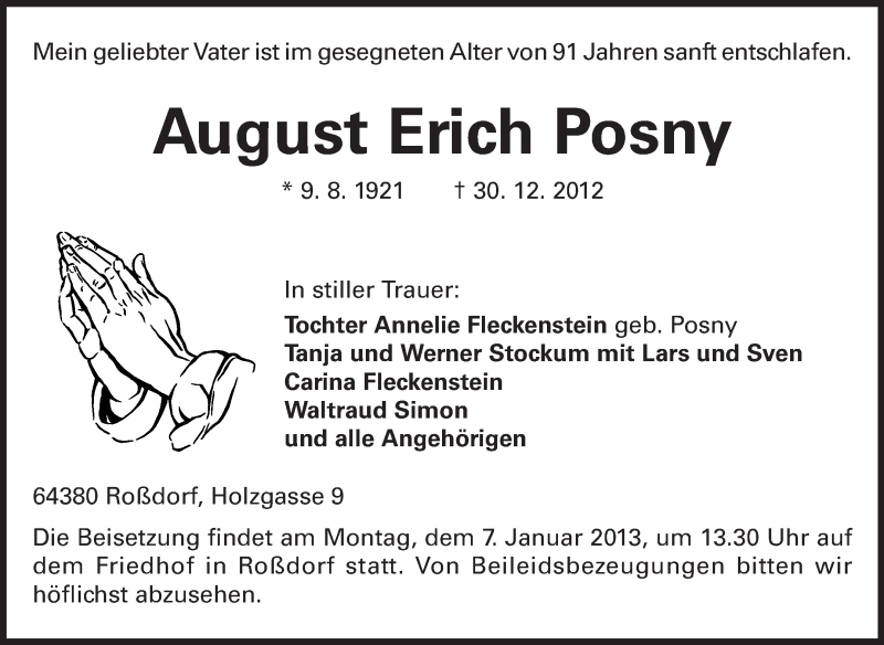 Hier finden Sie alle Traueranzeigen aus der Zeitung, die bisher für August Erich Posny erschienen sind. Weitere Traueranzeigen, die in der Zeitung erscheinen, werden hier ebenfalls aufgelistet