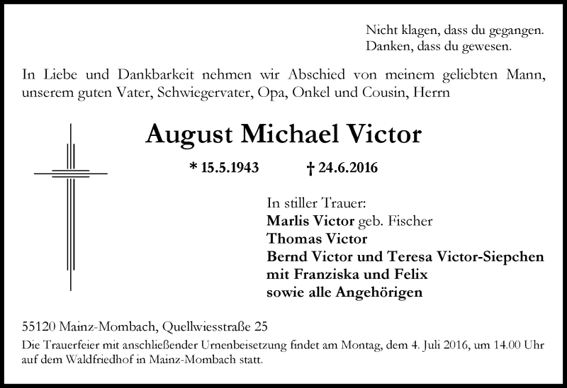 Hier finden Sie alle Traueranzeigen aus der Zeitung, die bisher für August Michael Victor erschienen sind. Weitere Traueranzeigen, die in der Zeitung erscheinen, werden hier ebenfalls aufgelistet