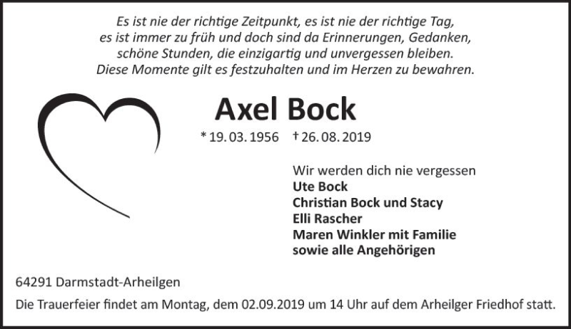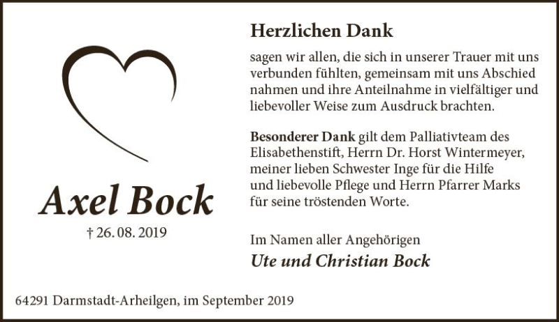 Hier finden Sie alle Traueranzeigen aus der Zeitung, die bisher für Axel Bock erschienen sind. Weitere Traueranzeigen, die in der Zeitung erscheinen, werden hier ebenfalls aufgelistet