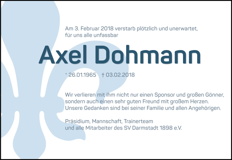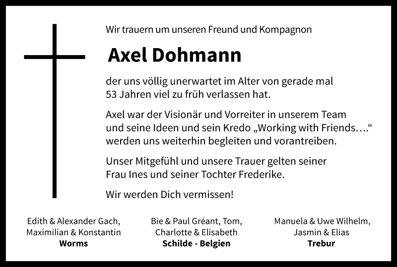 Hier finden Sie alle Traueranzeigen aus der Zeitung, die bisher für Axel Dohmann erschienen sind. Weitere Traueranzeigen, die in der Zeitung erscheinen, werden hier ebenfalls aufgelistet