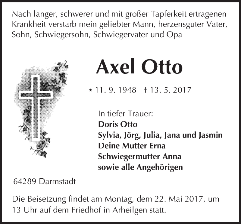 Hier finden Sie alle Traueranzeigen aus der Zeitung, die bisher für Axel Otto erschienen sind. Weitere Traueranzeigen, die in der Zeitung erscheinen, werden hier ebenfalls aufgelistet