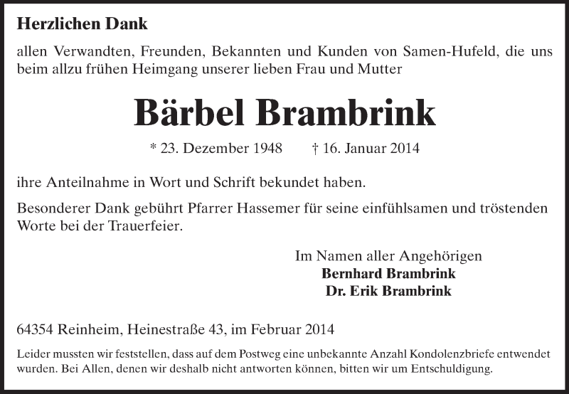Hier finden Sie alle Traueranzeigen aus der Zeitung, die bisher für Bärbel Brambrink erschienen sind. Weitere Traueranzeigen, die in der Zeitung erscheinen, werden hier ebenfalls aufgelistet