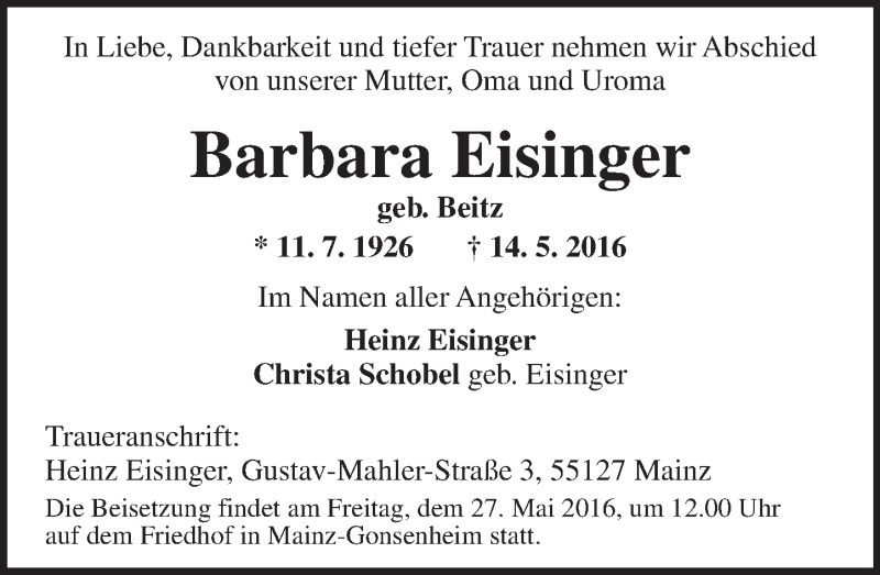 Hier finden Sie alle Traueranzeigen aus der Zeitung, die bisher für Barbara Eisinger erschienen sind. Weitere Traueranzeigen, die in der Zeitung erscheinen, werden hier ebenfalls aufgelistet