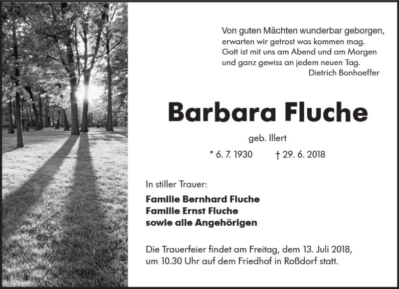 Hier finden Sie alle Traueranzeigen aus der Zeitung, die bisher für Barbara Fluche erschienen sind. Weitere Traueranzeigen, die in der Zeitung erscheinen, werden hier ebenfalls aufgelistet