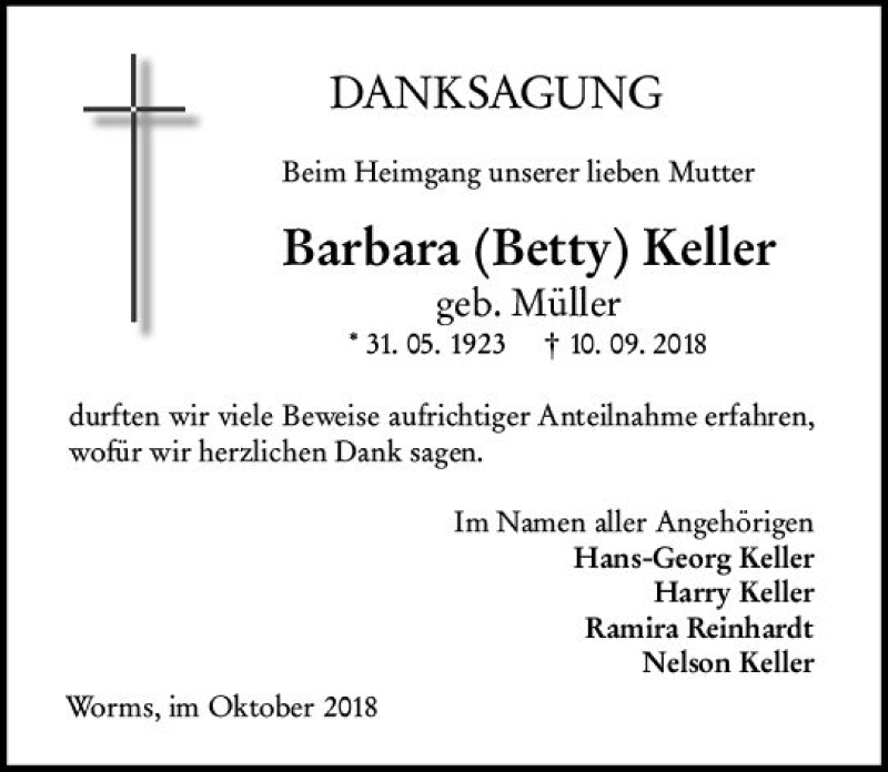 Hier finden Sie alle Traueranzeigen aus der Zeitung, die bisher für Barbara Keller erschienen sind. Weitere Traueranzeigen, die in der Zeitung erscheinen, werden hier ebenfalls aufgelistet