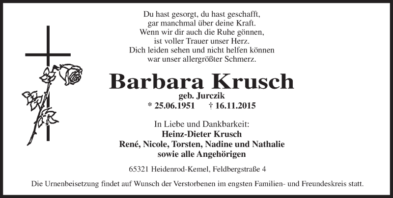 Hier finden Sie alle Traueranzeigen aus der Zeitung, die bisher für Barbara Krusch erschienen sind. Weitere Traueranzeigen, die in der Zeitung erscheinen, werden hier ebenfalls aufgelistet