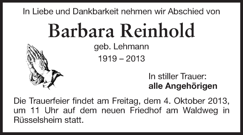 Hier finden Sie alle Traueranzeigen aus der Zeitung, die bisher für Barbara Reinhold erschienen sind. Weitere Traueranzeigen, die in der Zeitung erscheinen, werden hier ebenfalls aufgelistet