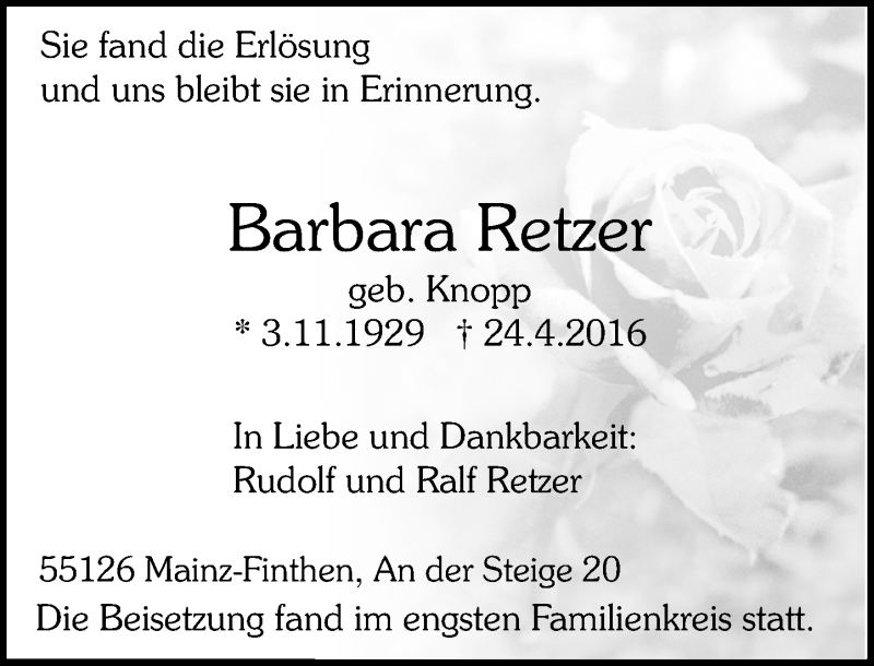 Hier finden Sie alle Traueranzeigen aus der Zeitung, die bisher für Barbara Retzer erschienen sind. Weitere Traueranzeigen, die in der Zeitung erscheinen, werden hier ebenfalls aufgelistet