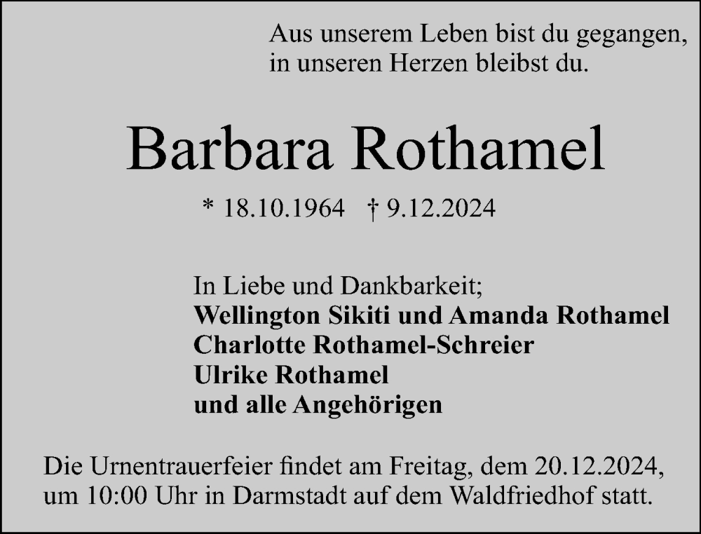Hier finden Sie alle Traueranzeigen aus der Zeitung, die bisher für Barbara Rothamel erschienen sind. Weitere Traueranzeigen, die in der Zeitung erscheinen, werden hier ebenfalls aufgelistet