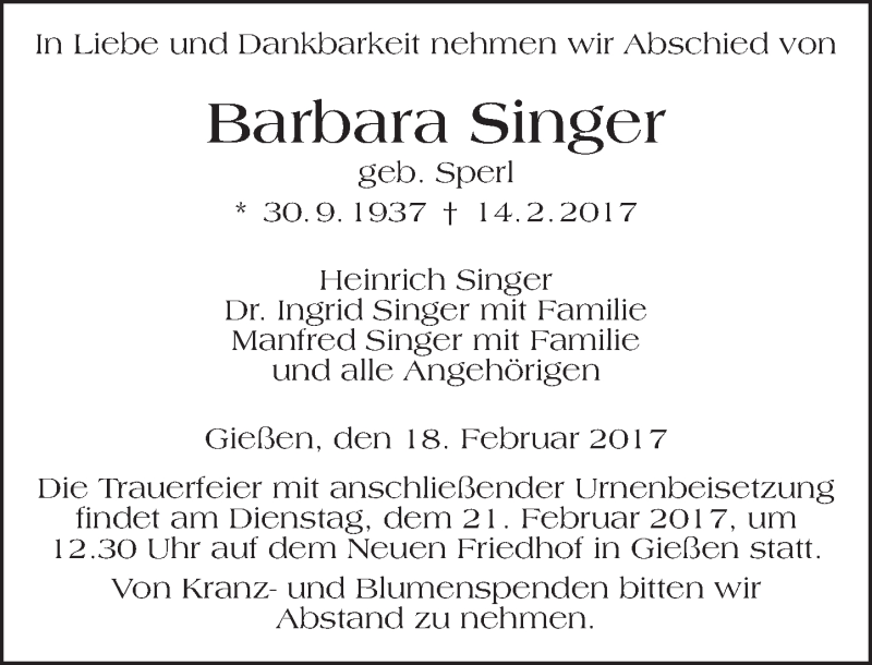 Hier finden Sie alle Traueranzeigen aus der Zeitung, die bisher für Barbara Singer erschienen sind. Weitere Traueranzeigen, die in der Zeitung erscheinen, werden hier ebenfalls aufgelistet