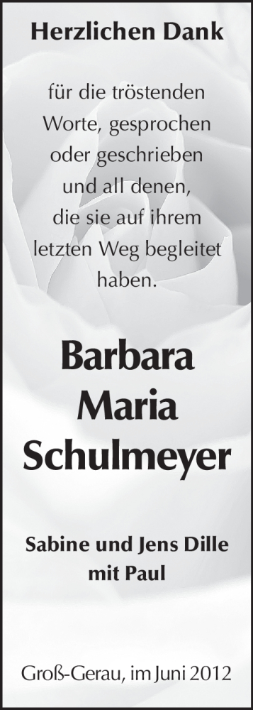 Hier finden Sie alle Traueranzeigen aus der Zeitung, die bisher für Barbara Maria Schulmeyer erschienen sind. Weitere Traueranzeigen, die in der Zeitung erscheinen, werden hier ebenfalls aufgelistet